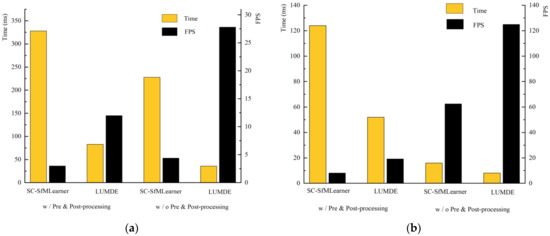 (a) Inference efficiency on an i5 core CPU; (b) Inference efficiency on an Nvidia GeForce MX330 GPU. In the inference stage, only the DepthNet is used to test inference efficiency. Pre- & post-processing refer to the necessary procedures for inference such as image resizing, read & write, and coloring. Image size is 640 × 320.