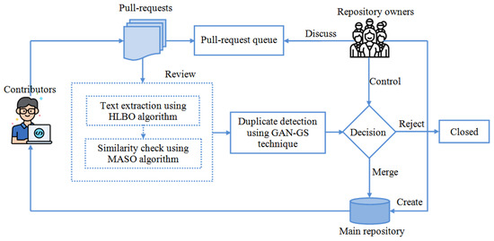 - A generative adversarial network (GAN) is merged with the global search (GS) algorithm to compute the duplicate contributions in pull requests.