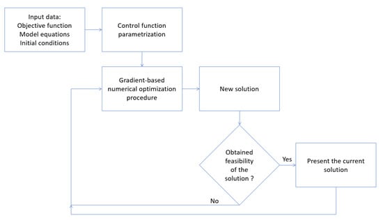 An important issue in any constrained optimization task is the problem of determining, whether a proposed solution is feasible/acceptable or not. The term "feasible" should clearly state whether a given solution meets the limitations and whether it is a potential application. The scheme of the proposed general solution procedure is presented in Figure 1. It takes into account the required input data in the form of the objective function (Equation (9)) and model Equations (10) and (11) with the given initial conditions (20), as well as additional inequality constraints (such as, e.g., (21) and (22)) that can be used to determine the type of feasibility of the obtained solution.