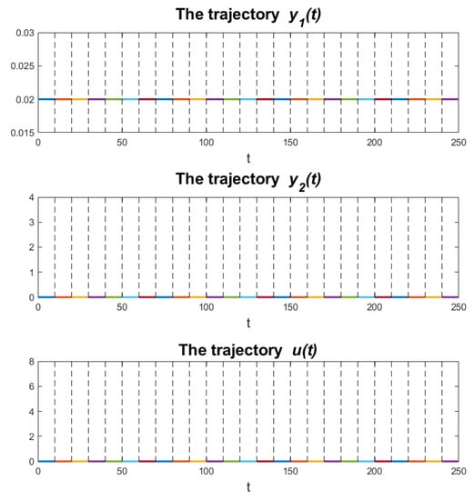In this section, some examples of intermediate results are presented. Figure 2 shows the situation when the control function does not influence the system. External input is within acceptable limits, i.e., in the whole range of the performed simulations. The initial conditions of the state variables correspond to the given values. While the trajectory satisfies the given boundary conditions, the trajectory satisfies only the initial condition. The condition for the final state is unfulfilled, which is, however, in line with expectations when there is no active influence of the function . Therefore, it is legitimate to ask whether the obtained solution can be treated as a feasible solution. The presented trajectories meet the constraints resulting from the model. Moreover, they are in line with the expectations when the control function does not act on the system. Nevertheless, the assumed optimization goal was not met, which seems to be obvious, when the calculations did not even start. Moreover, the key question of whether the user will consider such a solution as worth presenting should be asked, that is whether the presented trajectories meet the assumed conditions sufficiently to be considered an acceptable solution.