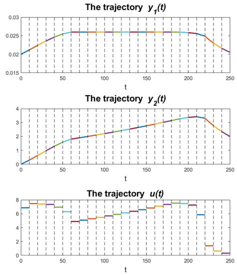 As already mentioned, as a result of the control vector parametrization, the range of the independent variable was divided into 25 sub-intervals. Thus, the nonlinear optimization problem took into account 25 decision variables that corresponded to the value of the control function . The state variables and at the beginning of the next sub-interval took the final values from the previous calculations.