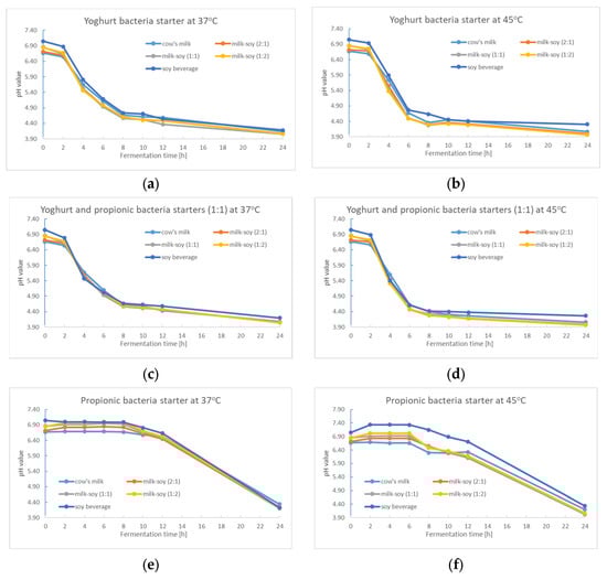 (a–f) The fermentation kinetics (mean values) of milk, milk–soya, and soya beverages with different starter cultures (yoghurt bacteria starter (a,b); propionic bacteria starter (e,f); a mixture thereof (1:1) (c,d)) at two different fermentation temperatures (37 °C (a,c,e) and 45 °C (b,d,f)).