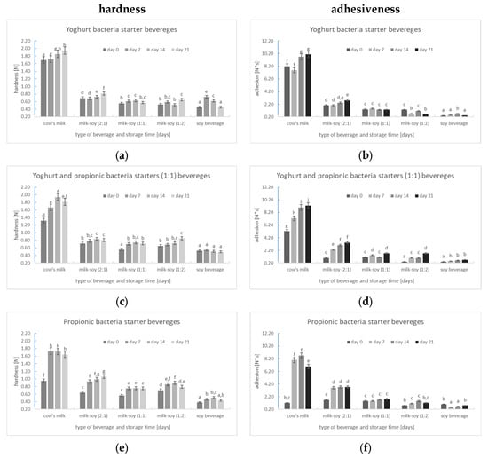 (a–f) Changes in the hardness (a,c,e) and adhesiveness (b,d,f) of milk, milk–soya, and soya yoghurt products obtained from beverages fermented using different starter cultures and stored at 5 °C for 21 days (mean values and standard deviations). a,b,c,d,e,f,g,h,i—The same letters on each chart mean there are no statistically significant differences between the compared numerical values (p < 0.05).