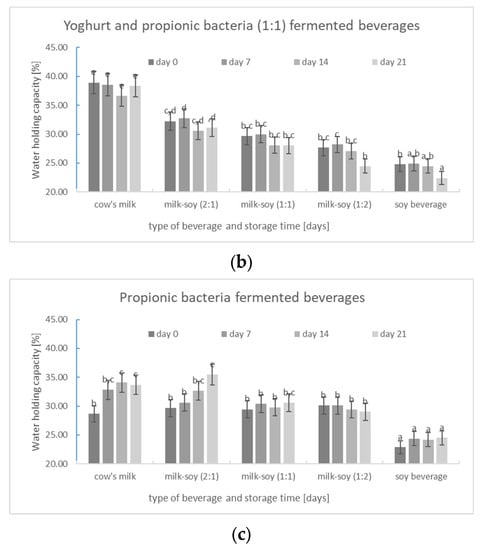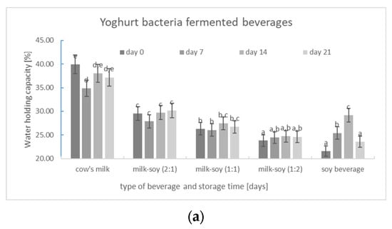 (a–c) Changes in water-holding capacity (WHC) of milk, milk–soya, and soya yoghurt products obtained from beverages fermented by different starter cultures and stored at 5 °C for 21 days (mean values and standard deviations). a,b,c,d,e—The same letters on each chart mean there are no statistically significant differences between the compared numerical values (p < 0.05).