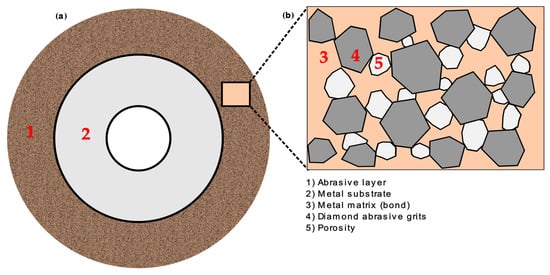 Diamond grinding wheels (DGWs) have a central role in cutting-edge industries such as aeronautics, defense and spatial applications. DGWs are mainly produced by powder metallurgy (PM) technologies such as the sintering process [1]. As illustrated in Figure 1, a DGW is composed of two parts: a matrix and diamond abrasive grits. The matrix, generally a metallic alloy, ensures the retention of diamond abrasive grits and acts as a binder for the cohesion of the wheel. Characterizations of DGWs are essential in order to optimize the design and machining performance of such cutting tools. One way is to quantify the abrasive power of DGWs. This quantity could be seen as a complex relationship between matrix wear and loosening diamond grits. Non-exhaustively, we could distinguish several approaches for the evaluation of DGW abrasive power: 3D topographic analysis of active surfaces [2,3], micro-geometric approaches [4,5] or in situ acoustic emission monitoring [6].