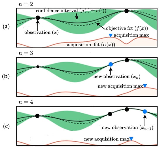 - Based on the initial observation points (i.e., sample points measured) from the objective function , a first regression attempt is made using an initial version of a Gaussian Process model. In addition, a confidence interval is built due to the probabilistic nature of the GP. Then, an acquisition function , derived from the GP model, is used to estimate the next computing step.
