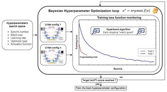 - Bayesian Optimization Loop (BOL): Once a U-Net configuration is trained and evaluated, the hyperparameter optimization loop begins. In fact, when a U-Net configuration is trained, a surrogate Gaussian Process model is fitted in real time by observing the influence of input variation (U-Net hyperparameters) on the outputs, the training loss functions and the corresponding IoU score. In addition, a “watchguard” mechanism is implemented through the Hyperband algorithm in order to automatically address unpromising training experiments to save computing resources. Thus, the optimization loop performs several iterations on the overall process (steps 1–3) by varying the U-Net configurations until the target IoU score is reached (IoU .