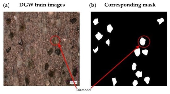 In recent years, in the data-driven era, with the rise of deep learning algorithms, semantic segmentation has become an extensively studied research area in the field of computer vision [7,8]. The aim of semantic segmentation algorithms [9] is to assign a separate class label to each pixel of an image for object detection purposes. Applications of such algorithms can be found in autonomous vehicles [10], where the pixel labels could be trees, cars, humans or roads, and in medical image analysis [11,12], where they could be cells, tumors or even brain activity analysis [13,14]. For DGW image segmentation, it is about diamond abrasive grits.