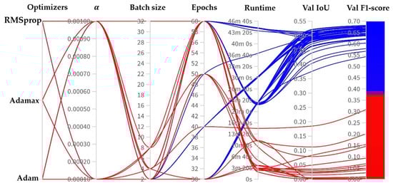 Opposite to Adamax, the Adam optimizer category has been the most explored by the algorithm, representing around 53.1% of the experiments. It counts around 26% of hyperparameter configurations with a validation IoU above 0.5 and 8.8% of failed experiments. However, with this optimizer, increasing the epoch number and batch size seems to reduce the segmentation performance and training stability. In fact, an augmentation of the epoch number tended to generate some overfitting phenomena observed with huge validation losses for experiments B3 and B5, as shown in Table 4. In addition, the best segmentation performances seem to be reached with an overall learning rate coefficient alpha of 1 × 10−4.