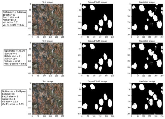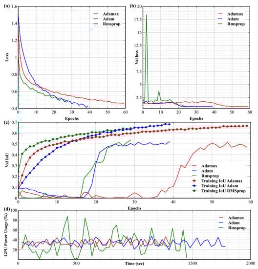 Regarding the loss evolution, RMSprop exhibits some overfitting behavior until the 20th epoch, as shown in Figure 10b. Adamax also has some predisposition to overfitting in the range of [20,21,22,23,24,25,26,27,28,29,30,31,32,33,34,35,36,37,38,39,40,41,42,43,44,45,46,47,48,49,50] epochs. Thus, the Adam optimizer tends to quickly converge toward a loss minimum and is more stable than the two others. In fact, Adam and Adamax converge 50% quicker than RMSprop by following a growing trend before 20 epochs, as shown in Figure 10c. On the other hand, RMSprop’s validation IoU tends to decrease from the 55th epoch.