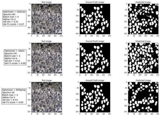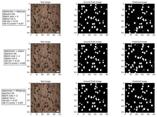 Although the reproducibility of deep learning experiments is a complex problem, the results conform to the best hyperparameter configurations found previously with our BO experiments. In fact, they are even better, with a validation IoU in the range of [0.51–0.53], and of [0.67–0.69] for the corresponding F1-score. On type I DGW images, the models performed relatively well, with an overall validation IOU of 0.52 and F1-score of 0.68, as shown in Figure 8. The RMSprop optimizer exhibits the best performance, detecting a labeled diamond grit not seen by the others. In addition, smoother segmentation with better edge detection was achieved by the RMSprop optimizer. On the type II images shown in Figure 9, some subtle differences began to appear in the segmentation quality, although the IoU/F1 score denotes the RMSprop configuration as the best. In fact, Adam detects more diamond grits than the two others, whereas RMSprop tends to better preserve the diamond grits’ shape. Although our models reached some overall acceptable segmentation scores, the type III images shown in Figure 10 highlight some limitations of only using IoU/F1-score for partially annotated ground truth. In fact, the RMSprop configuration is the worst one in regard to diamond grit detection. The best configuration in this case is Adam, which segments practically all the diamond grits. This highlights an important point about the selected segmentation metrics for evaluating model performances. For type III images, we found that IoU/F1-score are not well suited for evaluating the model performance, as the labels/real diamond numbers are strongly unbalanced. In such extreme cases of partially annotated labels, the IoU/F1-score should be used in conjunction with other metrics such as Dice, Hausdorff distance, partially annotated algorithms [75,76,77] and visual evaluation.