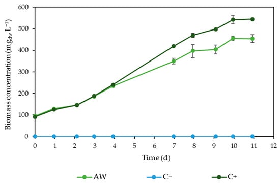 Batch experiments were conducted over 11 d in 1 L flasks, with a working volume of 900 mL. Different experimental conditions were tested (Figure 1): (i) a negative control test (C−) consisting only of 1 L of aquaculture wastewater; (ii) an assay with C. vulgaris in aquaculture wastewater (AW) in triplicate; and (iii) a positive control test (C+) with C. vulgaris in the modified OECD medium, in duplicate.