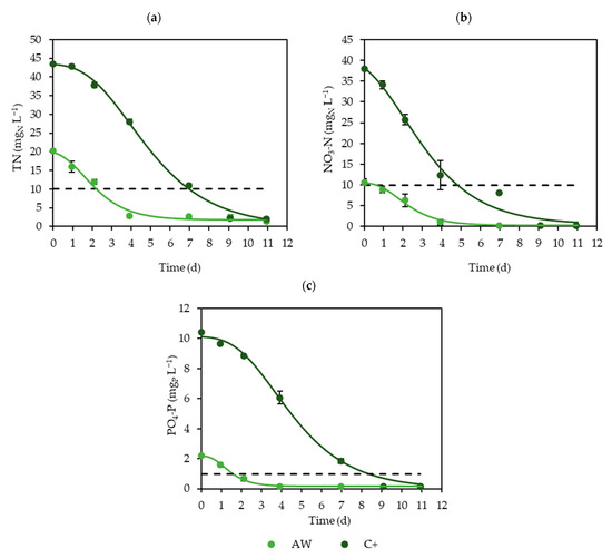 Experimental data and achieved modified Gompertz models (solid lines) for: (a) total nitrogen (TN); (b) nitrate-nitrogen (NO3-N); and (c) phosphate-phosphorus (PO4-P) concentrations in AW and C+ assays. The lowest EU legislation limits for treated urban wastewater discharged into aquatic bodies subject to eutrophication (10 mgN L−1 and 1 mgP L−1) are represented by horizontal dashed lines.