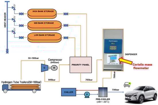 Sample layout for a hydrogen refueling station and the Coriolis mass flowmeter in the dispenser.