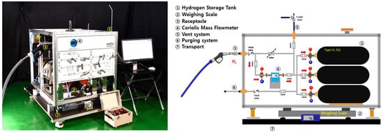 Several studies have investigated how to inspect and verify such accuracies of flow measurements under hydrogen-filling operating conditions at hydrogen refueling stations. It should also be noted that several portable gravimetric standards in national metrology institutes and the manufacturing companies of hydrogen dispensers in several countries have been developed for field verification according to the international recommendation for hydrogen refueling stations [6,7]. In a cooperative project for hydrogen vehicles by several European national metrology institutes, mobile gravimetric standards for verifying the measurements by the flowmeters inside the hydrogen dispensers were developed [8]. Several hydrogen refueling stations were tested in Europe using the gravimetric standard developed during this project for the purpose of research related to the MPE acceptance criteria as defined in OIML R 139-1, which is the international recommendation [6,7,8].