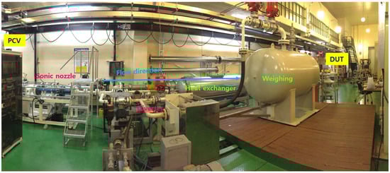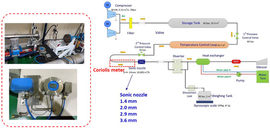 The density-matching approach for the Coriolis mass flowmeters for use during hydrogen gas refueling was utilized with an alternative fluid in the high-pressure gas flow standard system of KRISS [11]. The conditions of the pressure and temperature of compressed air, 40 bar and 20 °C, were selected so that test could be carried out at a density of around 46 kg/m3, equivalent to hydrogen gas at 700 bar and −40 °C. As shown in Figure 3, the high-pressure gas flow standard system at KRISS consists of two compressors, storage tanks with a capacity of 52.4 m3, a temperature loop of 19.7 m3, and control valves. This flow standard system is a blow-down type that generates a steady air flow in the pressure range of 1 to 5 MPa (10 to 50 bar). The maximum flowrate was 10,000 m3/h at standard conditions (101.325 kPa and 293.15 K). The extended uncertainty of this standard system was 0.18% at the 95% confidence level. A sonic nozzle (ISO 9300) [12] was used as a reference meter; it was calibrated by a gravimetric standard with a fast-acting diverter and a weighing tank.