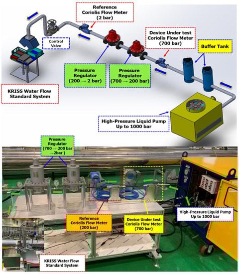 To investigate the pressure dependence of the mass flowmeter of a hydrogen refueling station, a high-pressure water flow test facility was developed, as shown in Figure 5. This facility consists of a high-pressure liquid pump (Ecotech-MR300) (up to 1000 bar), two buffer tanks (80 L) to reduce the transmission of excessive vibration and pulsations from the pump, and two pressure regulators (PRV-1000S, DASUNG ACE Co., Ltd., Seoul, Republic of Korea). The first pressure regulator controls the water pressure in the pipeline from 700 bar to 200 bar, while the second pressure regulator controls the pressure in a range of 200 bar to 2 bar. One Coriolis mass flowmeter was installed upstream of the two pressure regulators as the device under test (DUT) to evaluate the measurement characteristics with regard to the operating pressure conditions. The other Coriolis mass flowmeter was installed downstream of the two pressure regulators as a reference meter traceable to the KRISS National Water Flow Standard System, which is located at the end of the line of the high-pressure water flow test facility. The KRISS Water Flow Standard System is a gravimetric system operated by flow diverters that utilizes the flying-starting-and-finish method. The weighbridges can collect water into the weighing tank, which has a weighing capacity of 60 kg with a resolution of 0.1 g (Mettler Toledo, Columbus, OH, USA). To ensure the pressure effect of the Coriolis mass flowmeter installed upstream of the pressure regulators, the inlet water pressure was controlled by a high-pressure liquid pump and two regulators. The flowrate condition for testing from 1 to 5 kg/min was controlled by a control valve downstream of the high-pressure water flow facility.