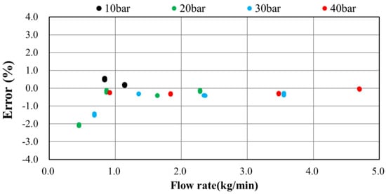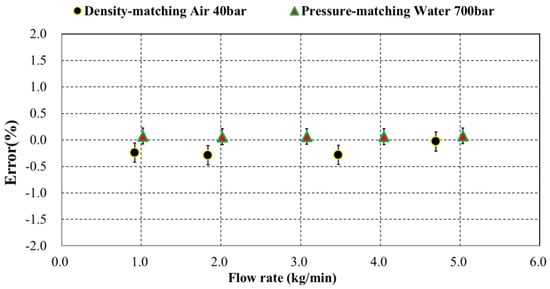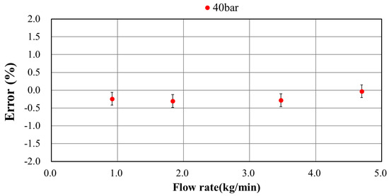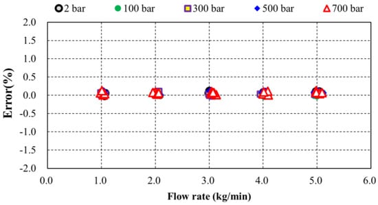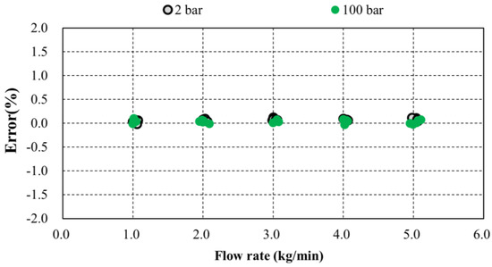 Figure 10 shows the measurement results of the Coriolis mass flowmeter when the inlet pressure of the water supplied to the flowmeter was 700 bar, equivalent to the operating pressure conditions at hydrogen refueling stations. The measurement characteristics of the Coriolis mass flowmeter for the pressure-matching approach were investigated in a pressure range of 2 bar to 700 bar at flowrates in the range of 1.0 kg/min to 5.0 kg/min. The error of the Coriolis mass flowmeter was within ±0.10% at flowrates from 1.0 kg/min to 5.0 kg/min, and the average error was ±0.10%. The measurement results of the Coriolis mass flowmeter for the pressure-matching approach show no detectable dependence of the pressure on the accuracy of measurement performance in the pressure range of 2 bar to 700 bar. It can be assumed that the pressure corrections implemented by the manufacturer of the Coriolis mass flowmeter work well in the pressure and flowrate ranges utilized in this study.
