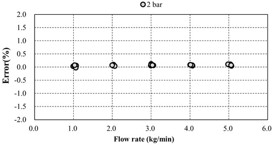 Figure 8 presents the test results of the Coriolis mass flowmeter when the inlet pressure of the supplied water is set to 2 bar. Five different mass flowrates ranging from 1.0 kg/min to 5.0 kg/min were used, as this is the most relevant mass flowrate range regarding the hydrogen refueling process. At each measuring point, three repeated measurements were taken. The error (%) is defined as the relative difference between the measurement results of the Coriolis mass flowmeter installed upstream for the pressurized condition and for the other Coriolis mass flowmeter installed downstream of the two pressure regulators. The Coriolis mass flowmeter installed at the downstream location was used as the reference meter, given its traceability to the KRISS National Water Flow Standard System. The error of the Coriolis mass flowmeter was within ±0.10% at flowrates from 1.0 kg/min to 5.0 kg/min, and the average error was ±0.10% The repeatability of three measurements at each flowrate was less than ±0.04%.