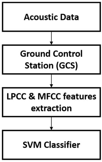 An acoustic-based detection system was designed and implemented in [30] to detect and locate the UAVs efficiently. The acoustic sensor array configuration comprises two tetrahedron-shaped microphones. The system uses multiple algorithms for data and features extraction from the collected acoustic signals: cepstral coefficients (CC) for extracting the harmonics’ features, SVM to classify and distinguish between the extracted features’ vectors related to UAV or background noise, and TDOA based on Bayesian framework. Signal processing is concluded with the temporal and dimensional features’ vectors calculations to acquire the accurate UAV classification and localization path. They also study the contribution of the SNR in detecting the UAVs against the detection rate.