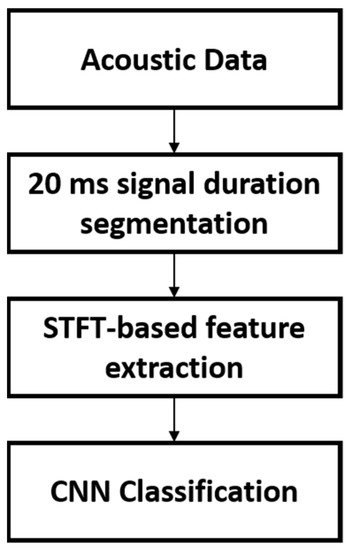 Authors in [39] proposed a CNN-based system to detect drones using acoustic signals received by a microphone. STFT magnitude is used as the two-dimensional feature in the study since drones’ harmonic properties differ from those of other devices that make a similar noise. The dataset comprised 68,931 and 41,958 frames of drone and non-drone sounds collected using DJI Phantom 3 and 4 drones flying outdoors. The proposed approach has a detection rate of 98.97% for the 100-epoch model and a false alarm rate of 1.28. Figure 5 illustrates the system overview of the proposed approach.