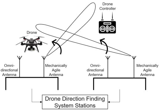 The proposed system in [12] utilizes a low-cost passive RF-based UAV detection and localization method. The system computes AOA for the RF-based signal to determine whether the transmitted signals’ peaks correspond to the UAV or its controller. Then, it uses the triangulation technique to estimate the location of RF signal peak sources. The free-space path loss model and triangulation combination is reported in [50] to detect and localize a stationary drone controller. The proposed system contains two direction-finding systems for direction identification and localization for the drone and its controller. Each direction-finding system has an omnidirectional antenna for detecting drone signal occurrence and a mechanically agile directional antenna for directions identification and localization of RF signal peaks for UAV and/or its controller signals. The whole system is depicted in Figure 8.