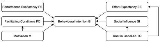 Trust is an important construct that has been used and validated in the context of e-learning systems [60], even though the original UTAUT model does not emphasize trust as a factor that influences the intention to use. For the acceptance of mobile learning systems, trust is an important construct [61]. The construct of trust has also been considered for CodeLab, not in terms of security but in terms of trust in the system (TC) that it will help them to learn to code. Trust is not a core construct of UTAUT; it has been used and validated in e-learning [62]. In this study, we considered a mediating effect between TC and EE and SI as the degree of ease of use of the system and that the people who influence a person’s behavior can inculcate TC.