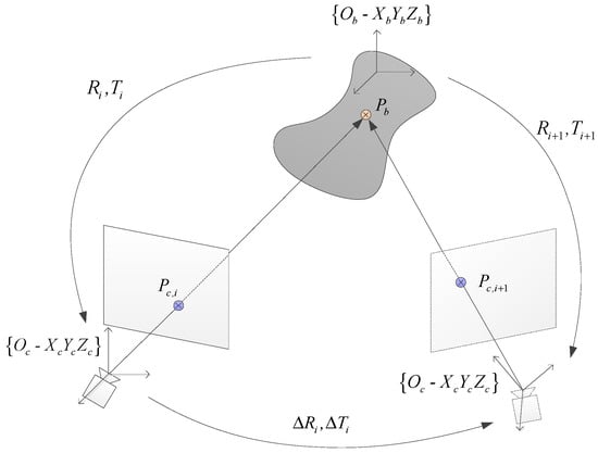 The above observation movement process is essentially the relative movement of the camera and the object. It can be understood in two equivalent ways. The first interpretation is the real physical state; that is, the camera does not move, and the object moves. The second equivalent interpretation is to take the object as a reference. Imagine that a person stands on a moving object and observes a fixed camera. This can be equivalent to the object not moving and the camera moving, as shown in Figure 3. Therefore, Ri and Ti represent the rotation attitude matrix and translation vector of the camera-fixed frame {Oc-XcYcZc} from moment i to moment i + 1.