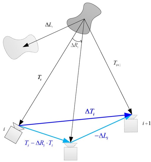 Equation (10) provides the relationship between object motion and camera equivalent motion. Note that Ti consists of two parts, and the part represents the equivalent translation vector of the camera-fixed frame caused by the object rotation.