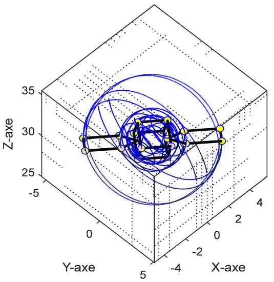 Spatial motion trajectories of the object feature points. The yellow points represent the feature points of the object. The blue curves represent the trajectories of the feature points, and the black line displays the main outline of the object.