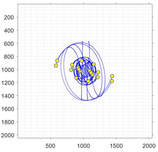 Object image feature points and their trajectories. The yellow points represent the feature points of the object in the image. The blue curves represent the trajectories of the feature points.