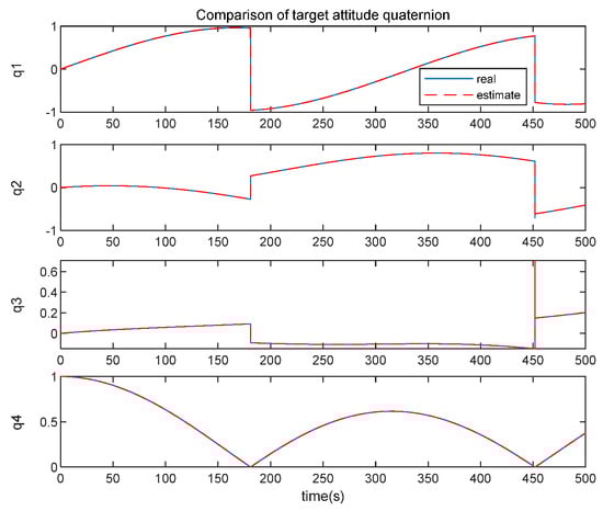 Comparison of the object attitude quaternion. This figure is the comparison of the object attitude quaternion. The red dotted curve is the result estimated by the proposed method, and the blue solid curve is the real state of the object simulation.