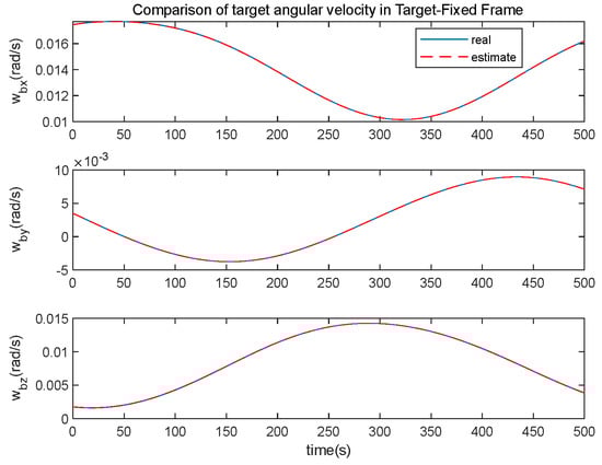 The attitude quaternion and angular velocity of the object are obtained by the method in this paper, as shown in Figure 8 and Figure 9, where the red dotted curve is the result estimated by the proposed method, and the blue solid curve is the real state of the object simulation.