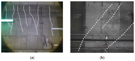 In the 40–60 m section, when compressive stress was applied to the wall at the boundary point, a transverse crack at the top of the wall and a diagonal crack in the slab at the bottom of the end point occurred, as shown in Figure 13a. In the 80–100 m section, as shown in Figure 13b, oblique cracks occurred owing to the compressive stress on the wall at the boundary point. Transverse and oblique cracks occurred in the lower part owing to the compression of the end wall.
