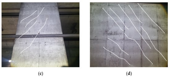 Figure 1 illustrates the location of the damaged subway box structure. Most networks of fine cracks generated in the ceiling had a crack width of 0.1–0.2 mm. Several diagonal cracks (cw: 0.1–0.3 mm) and transverse cracks (cw: 0.2–0.4 mm) occurred, which were not found five years ago in the columns and walls in the mainline section, as illustrated in Figure 1a–d. The cracks in Figure 1a were caused by differential settlement. Figure 1b shows that diagonal cracks occurred owing to the increase in soil pressure, decrease in sidewall pressure, decrease in soil pressure, and long-term loading. Figure 1c,d shows the torsion due to flexural tension.