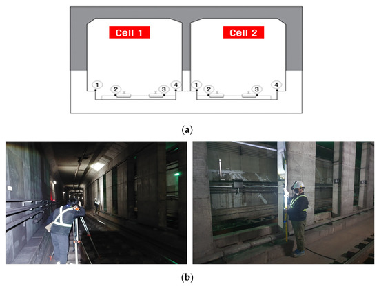 As shown in Figure 2a, to measure the displacement of the structure, leveling was conducted at four points in each up-track and down-track every 10 m, with a total of 104 points. Figure 2b shows the optical leveling. Damage to the subway box structure of Cells 1 and 2 occurred at the point of soft rock, resulting in tensile cracks in the upper part. A sinusoidal crack occurred at the boundary between the soft rock and granitic soil. Settlement occurred in the middle part of the granitic soil, resulting in tensile cracks in the upper and lower parts of the subway box structure.