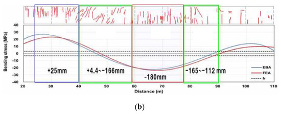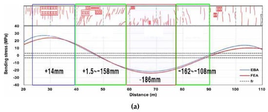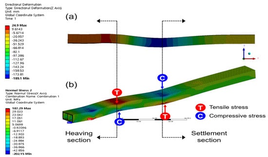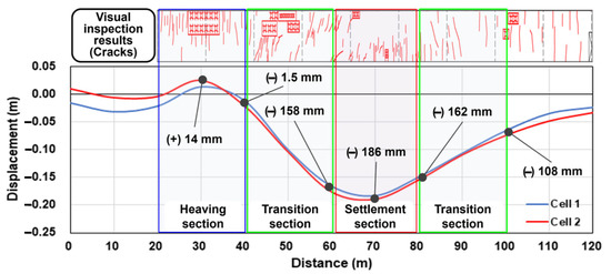 However, the level of shear stress was small and the onsite crack level was also relatively small in the 80–100 m section where the settlement was converged in the maximum settlement section, as illustrated in Figure 10b, which was a transition section whose deviation of displacement was evaluated to be relatively small. Therefore, the damage level at the transition section directly affected the deviation in the displacement at the adjacent section, verifying that the transition section where settlement and heaving occurred simultaneously, was more vulnerable.