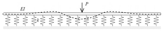 The analysis of beams in elastic ground was assumed to be proportional to the degree of deformation rather than the reaction force of the elastic ground. In 1867, Winkler proposed the continuous elastic foundation beam theory [23]. It is a technique used to examine the behavior of flexible structural elements in contact with supporting and bearing soils as an infinite continuum by idealization employing a simplified continuum model, as shown in Figure 4.