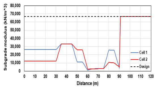 As shown in Table 1, the subgrade reaction modulus due to settlement and heaving differed depending on the location. Additionally, the subgrade reaction modulus in the maximum settlement section was reduced by approximately 95% compared to that in the maximum heaving section.