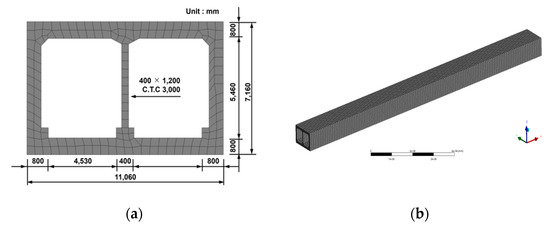 The structural safety of the subway box structure was investigated via finite element analysis. Based on the leveling data, 3D modeling was performed for the subway box structure of 120 m. ANSYS Workbench (Cannonsberg, PA, USA) [25] v. 2021.1R was used as the finite element analysis program, and solid elements were used for 3D modeling. Nodes and elements are calculated automatically during their generation in the ANSYS Workbench program. The mesh of the box model contained 229,836 nodes and 40,800 elements. The element size of the subway box structure was assumed to be 500 mm. Figure 6a,b show the front view mesh and 3D view of the subway box structure, respectively. For the boundary condition, the tunnel bottom was fixed under the supported conditions. The subgrade reaction modulus measured at the site was applied to the bottom part of the subway box structure for each section.