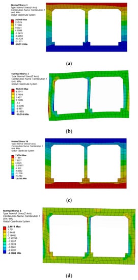 Furthermore, as shown in Figure 8a–d, the box structure in the section where the maximum heaving and settlement occurred was a continuum structure with a nonuniform subgrade reaction modulus in the longitudinal direction. There was a significant difference in the deviation of stress in the corner, exterior, and lower haunches owing to the displacement behavior of the box structure, thus inducing torsional behavior.
