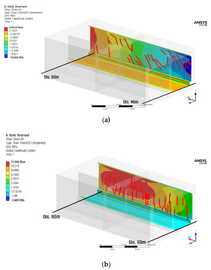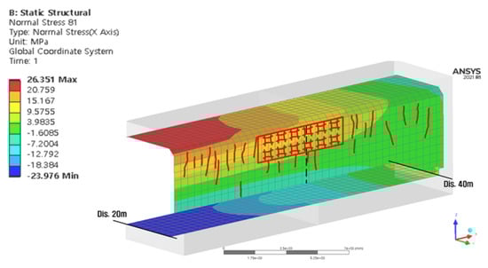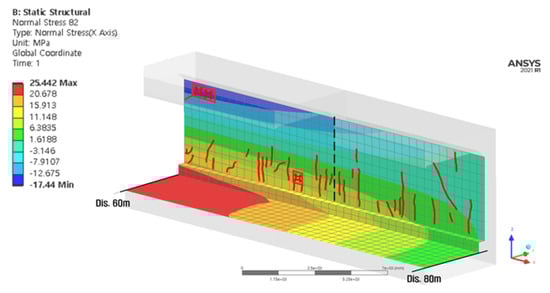 Comparing the visual inspection mesh diagram and FEA of the Cell 2 wall, it can be inferred that transverse cracks occurred in the 20–40 m section because of the compressive stress of the heaving wall, as shown in Figure 12.