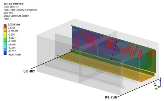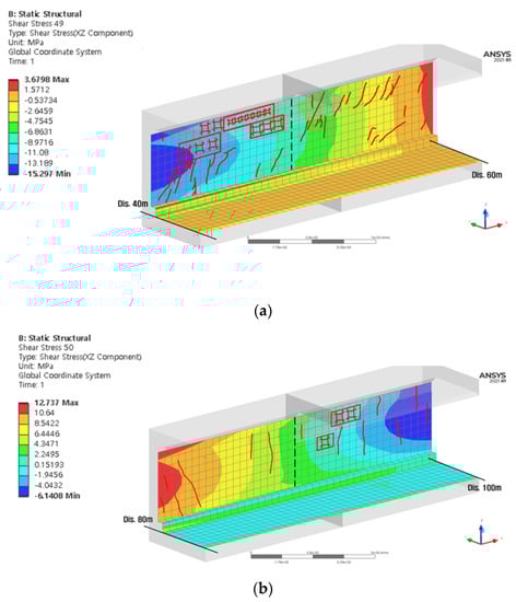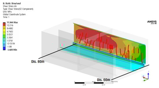 The analysis results of the wall stress in the transition section showed that shear stress that exceeded the allowable shear stress occurred in the wall at the 40–60 m section because of the extreme difference in the displacement and stress of the structure, which occurred in the maximum heaving and settlement sections, as illustrated in Figure 10a.