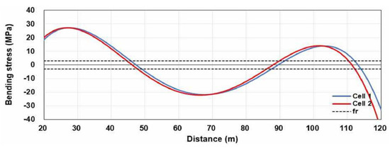 The bending stress exceeded the concrete rupture modulus in most sections. The concrete rupture modulus in Figure 15 was obtained using Equation (4).