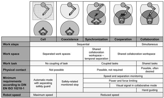 Figure 1 shows a classification of cooperation levels between humans and robots into five types—cell, coexistence, synchronized (also sequential cooperation [32]), cooperation, and collaboration—depending on the workspace, the task, and the required safety mechanisms [18,33]. Cellular operation represents the classical safety fence operation of industrial robots, which is used in fully automated processes, while the other types of collaboration are typically realized with collaborative robot systems.