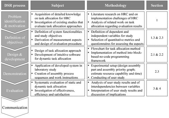 The research work presented in this article is based on the Design Science Research (DSR) framework [45,46] and follows the DSR procedure model proposed in [46]. Figure 2 shows the contents of this article and links them to the phases of the DSR process. In addition, the methodological approach within the phases is briefly described and a reference to the individual sections of this article is given.
