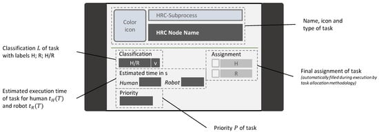During the above explained process creation, the individual HRC nodes are created and interlinked, and the properties of these nodes are entered via input masks. As shown in Figure 5, these properties cover information about the task classification, the estimated execution time of the task for humans and robots, and the priority of the task. The latter serves as an additional decision criterion to determine a suitable prioritization with regard to the execution sequence of tasks.