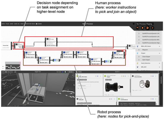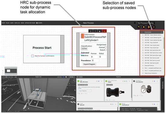 Figure 8 and Figure 9 show the user interface of the ComFlow framework with the implemented nodes for HRC task allocation. The task creation, i.e., the creation of HRC sub-processes, is depicted in Figure 8. The initial decision node switches the subsequent process sequence between human and robot depending on the final task assignment according to the higher-level task allocation algorithm. The sub-process is then saved by entering a name as well as selecting the process type sub-process. For creating the overall assembly process, the saved sub-process can then be selected as a sub-process node and added via drag-and-drop, as shown in Figure 9. The HRC sub-process nodes comprise the properties explained in Section 2.2.2.
