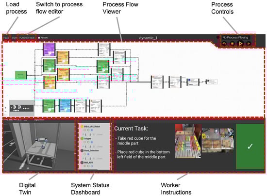 An exemplary assembly process with multiple connected HRC nodes is shown in Figure 10. After saving the process with type selection process the user can switch into the process flow viewer intended for workers and start the process execution using the process control buttons (Figure 11). As explained in Section 2.2.1, the assembly instructions for the tasks assigned to the human are displayed in the lower part of the screen and the progress of the process is visualized in the process flow viewer by changing the status color of the individual blocks.