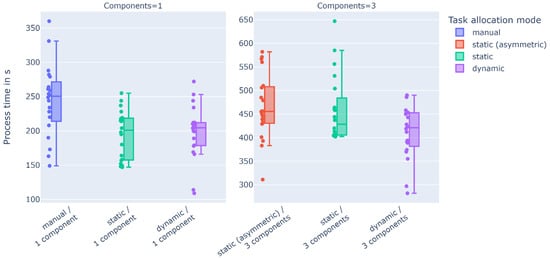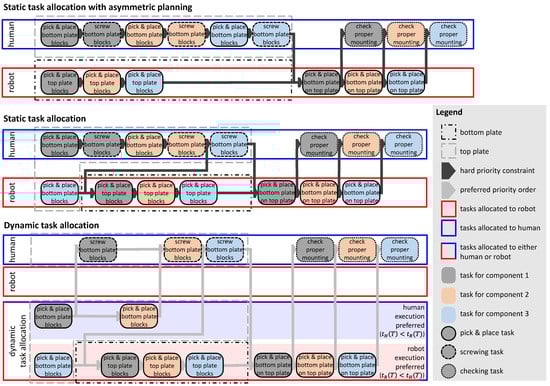 This article addresses the planning challenge of task allocation, i.e., an effective division of labor between humans and robots. The allocation of tasks to humans or robots can be performed either statically, i.e., prior to task execution, or dynamically, i.e., in response to changes during the task execution [25,26]. In the literature, various methods for both static and dynamic task allocation have been proposed (see Section 1.2). However, on the one hand, apart from validating the principal functionality of the respective methods or evaluating them in simulation studies, no comprehensive evaluation in an experimental test setup has yet been conducted that systematically examines and empirically assesses the advantages and disadvantages of both approaches to task allocation. On the other hand, related approaches do not focus on an intuitive and integrated creation of the HRC assembly processes.